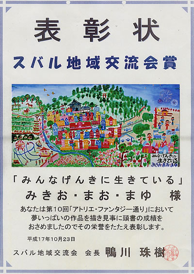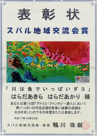 平成17年度 アトリエファンタジー通り 平成17年度 アトリエファンタジー通り スバル地域交流会賞 受賞者 「川は魚でいっぱいダヨ」 はらだあきら・はらだあかり様 「みんなげんきに生きている」 みきお・まお・まゆ様
