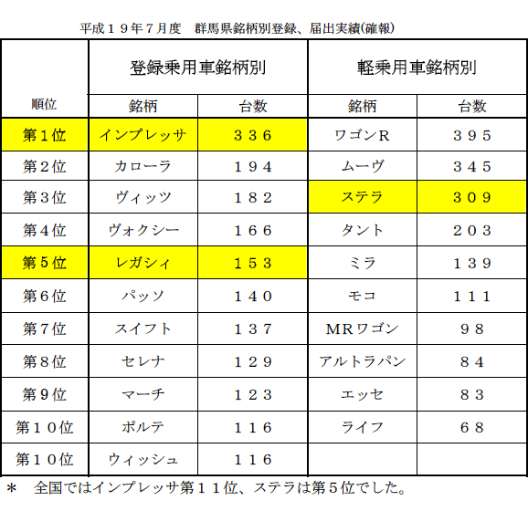 7月度の群馬県内登録乗用車銘柄別販売台数順位で『インプレッサ』が、みごと第1位に輝きました!!
