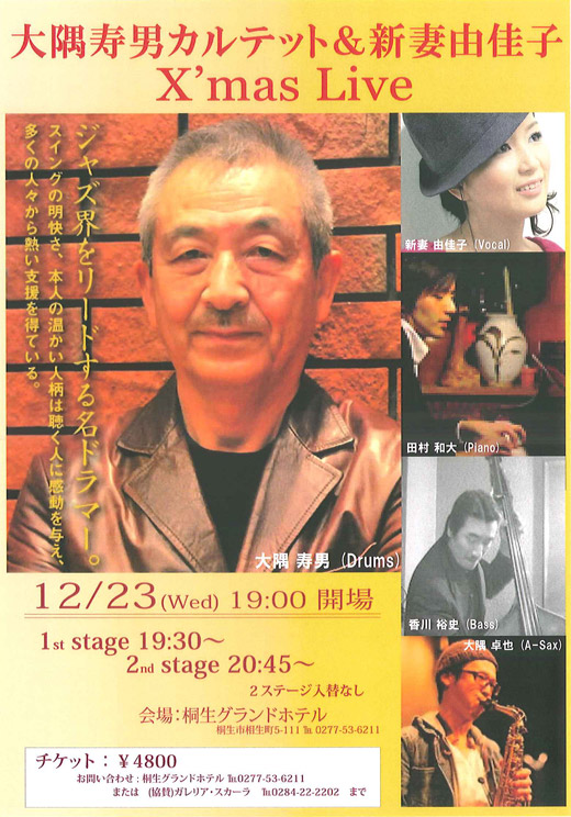11月27日行われた「ふれあいコンサートJAZZの夕べ」に出演されたドラマーの大隅寿男さんが12月23日(水)に桐生グランドホテルにて「大隅寿男カルテット&新妻由佳子X’mas Live♪」を行います。